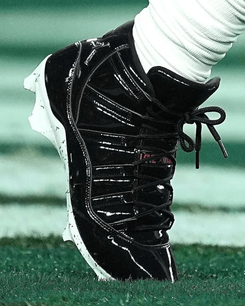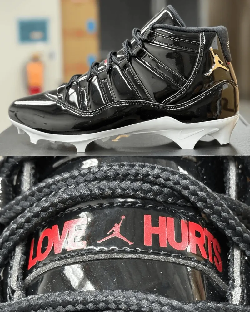 比赛中,赫茨也穿着定制防滑钉版漆皮Air Jordan 11“Love Hurts”PE。