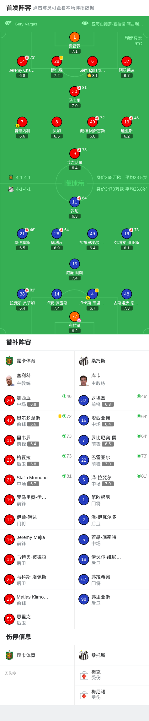北京时间4月9日南美洲球会杯 小组赛 第1轮,昆卡体育对阵桑托斯。桑托斯布拉藏自摆乌龙。最终比分昆卡体育 1-0 桑托斯。