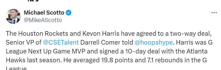 北京时间7月4日,据名记Scotto报道,火箭队与凯文-哈里斯已达成一份双向合同,哈里斯曾是G联赛“明日之星”赛事的MVP,上赛季与亚特兰大老鹰队签下过一份为期10天的合同。他在发展联盟场均得到19.8分和7.1个篮板。火箭网站rocketswire表示,这也意味着火箭新赛季15+3的阵容基本确定。