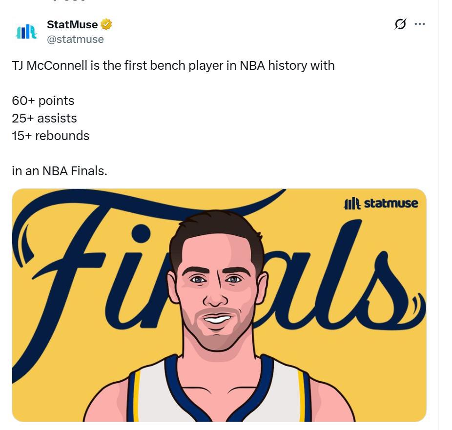 此外,麦康奈尔还创下了NBA历史第1神迹。数据显示,本届总决赛至今,麦康纳尔替补贡献68分27助攻19篮板,他是NBA历史上首位达成60+得分25+助攻15+篮板数据的替补球员。